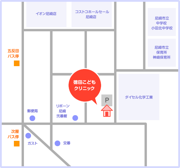 山手幹線ロピア尼崎島忠ホームズ店前『次屋交差点』を東進し、コストコ角の信号『神崎交差点』を南へ右折、約500m南進すると右手に当院があります。