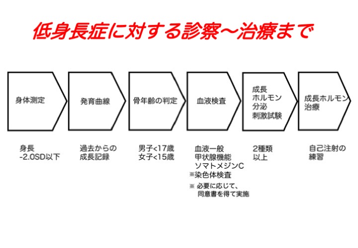 様々な原因がありますが、成長ホルモン治療の対象になるもの(成長ホルモン分泌不全性低身長症、タ-ナ-症候群、軟骨異栄養症、プラーダーウイリ症候群、慢性腎不全に伴う低身長)とならないものに分類できます。 - 問診、計測、診察を行い、血液検査とレントゲン検査を行います。女児の低身長の場合、タ-ナ-症候群を疑って染色体検査が必要になることもあります。
