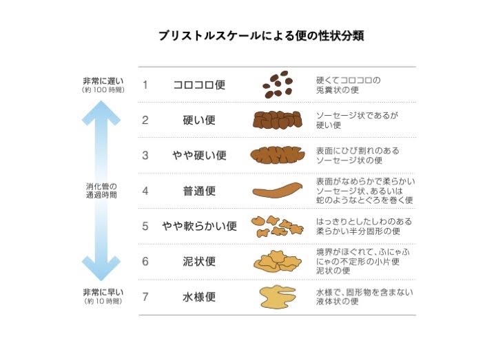 便の硬さは図に示す『ブリストルスケール』という7段階の硬さで評価しますが、理想の便は3〜5です。